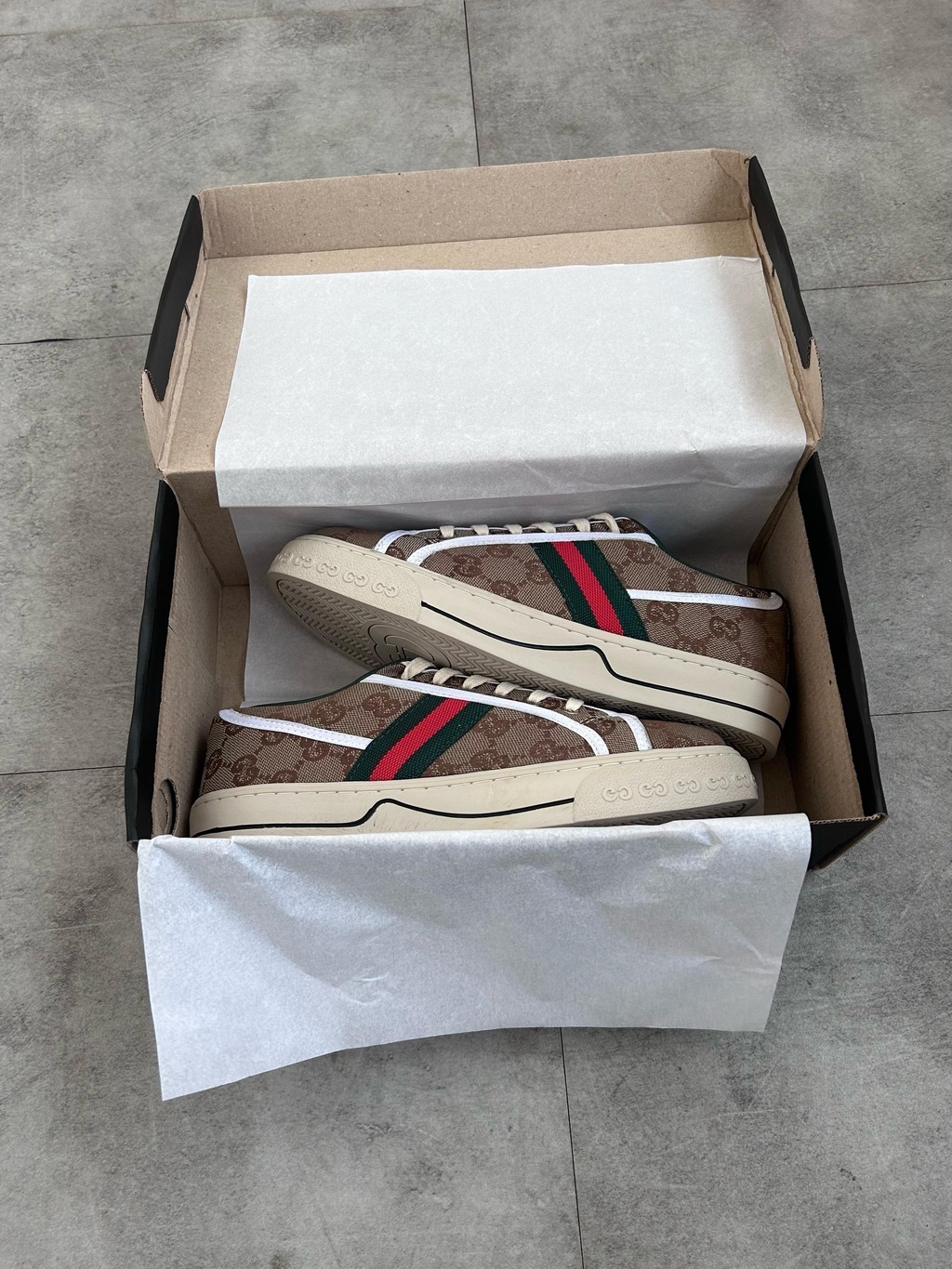 O tênis de cano baixo é apresentado em canvas com GG mini nas cores bege e ébano. O modelo combina diferentes elementos clássicos da marca, como a etiqueta Gucci Tennis 1977, a padronagem GG texturizada e a icônica faixa Web - detalhes que remetem à afinidade Gucci com o mundo dos esportes.
